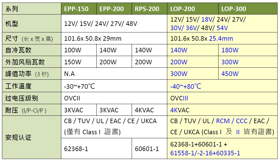 LOP-200/300 系列相較于銷售中 EPP-150/200、RPS-200 系列,主要差異詳如下表,包含薄型化 (1" 高)、12~54V 電壓更齊全、4" x 2" 尺寸下功率推升至 300W、具備 150%@3秒 供載能力、-40~+80℃ 工作溫度更寬、符合 OVCIII、一機(jī)同時(shí)擁有 62368-1/60601-1/61558-1/60335-1 各種安規(guī)認(rèn)證,可涵蓋應(yīng)用領(lǐng)域更廣,適用于資通訊電子儀器、醫(yī)療裝置、工廠自動(dòng)化、家用裝置……等應(yīng)用。