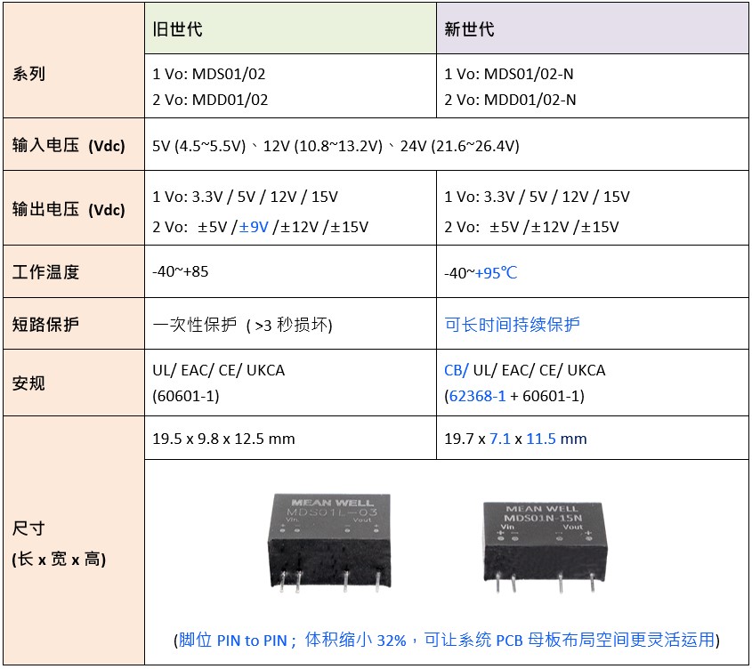 明緯模塊型醫(yī)療級(jí)DC-DC轉(zhuǎn)換器繼MDS01/02及MDD01/02系列后新上市性價(jià)比更好的MDS01/02-N、MDD01/02-N系列,新舊世代主要差異如下: