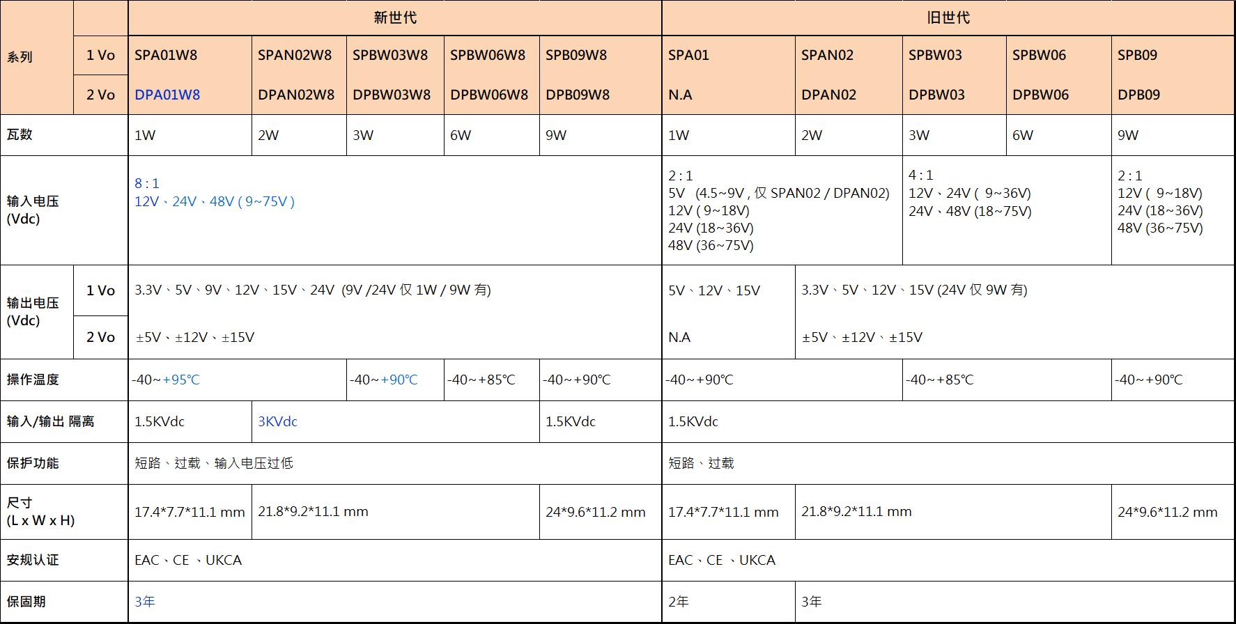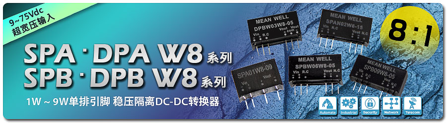 明緯 DC-DC 模塊型單組輸出 SPA01 / SPAN02 / SPBW03 / SPBW06 / SPB09 及雙組輸出 DPAN02 / DPBW03 / DPBW06 / DPB09 SIP 單排引腳封裝 1~9W 2:1 及 4:1 輸入機(jī)型上市多年,年銷數(shù)十萬臺(tái),廣泛應(yīng)用于電力、電子儀表、通信設(shè)備、工業(yè)自動(dòng)化控制、IoT…等, 新上市超寬壓輸入單組輸出 SPA01W8 / SPAN02W8 / SPBW03W8 / SPBW06W8 / SPB09W8 及雙組輸出 DPA01W8 / DPAN02W8 / DPBW03W8 / DPBW06W8 / DPB09W8 等 5 系列,最大亮點(diǎn)為 8:1(9~75Vdc)超寬壓輸入范圍,不僅可滿足更寬輸入電壓需求,更因輸入范圍統(tǒng)一為 9~75Vdc,機(jī)型選擇大幅簡(jiǎn)化,讓選型變得更容易。新品 5 系列引腳與舊品兼容,可讓終端設(shè)備設(shè)計(jì)者以新代舊無痛替換,新 vs 舊世代主要特點(diǎn)及規(guī)格差異請(qǐng)參考下表: