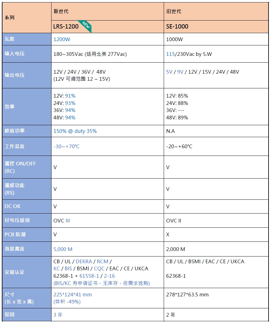 明緯全新系列LRS-1200,在尺寸、效率、規(guī)格、安規(guī)、耐用性及價(jià)格…等方面均有顯著提升,性價(jià)比更高,可完全取代 SE-1000系列。新品 vs 舊品詳細(xì)規(guī)格差異如下表: