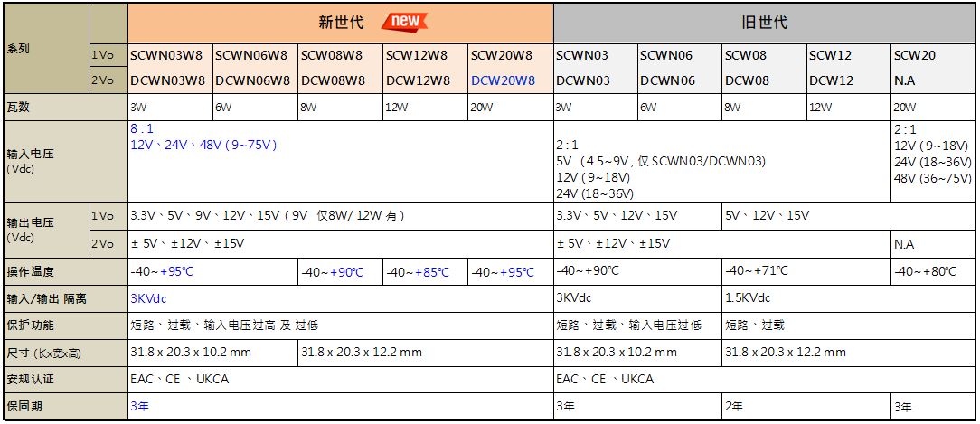 明緯DC-DC模塊型單組輸出SCWN03/ SCWN06 / SCW08 / SCW12 / SCW20及雙組輸出DCWN03 / DCWN06 / DCW08 / DCW12 DIP 雙排標(biāo)準(zhǔn)引腳封裝3~20W 2:1 輸入機(jī)型上市多年,年銷(xiāo)數(shù)十萬(wàn)臺(tái),廣泛應(yīng)用于電力、電子儀表、通信設(shè)備、工業(yè)自動(dòng)化控制、IoT…等, 新上市次世代8:1輸入超寬壓輸入單組輸出 SCWN03W8/ SCWN06W8 / SCW08W8 / SCW12W8 / SCW20W8及雙組輸出 DCWN03W8 / DCWN06W8 / DCW08W8 / DCW12W8/ DCW20W8共5系列。