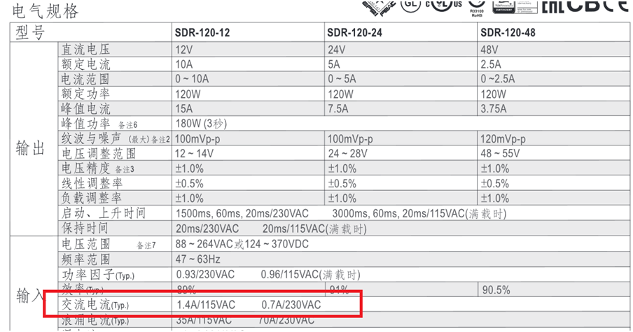 根據(jù)以下明緯官網(wǎng)SDR-120規(guī)格書得知于230VAC下,滿載輸入交流電流為0.7A。