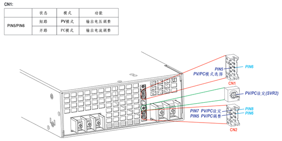 其輸出電壓電流的數(shù)值可藉由PV/PC功能來(lái)設(shè)定。此系列的PV/PC功能只能擇一使用,其選擇方式是藉由CN1的 PIN5/PIN6 開(kāi)路或短路來(lái)決定;若是短路,則是選擇PV模式,可以調(diào)整輸出電壓;若是開(kāi)路,則是選擇PC模式,可以調(diào)整輸出電流。