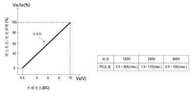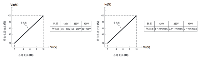 在PV模式下,有三種可以調(diào)整Vo的方式,第一種方式是藉由SVR2調(diào)整,其調(diào)整范圍為額定電壓的20~100%。第二種方式是在CN2的PIN7/PIN8之間外加一直流電壓訊號(hào)Vs,其調(diào)整范圍為額定電壓的20~100%,請(qǐng)參考圖六所示;若Vs<2V,則Vo≧額定電壓的10%。第三種方式是在CN2的PIN5/PIN6之間外加一直流電壓訊號(hào)Vs,其調(diào)整范圍為額定電壓的8~100%,請(qǐng)參考圖八所示,范圍較寬,且響應(yīng)速度較快。