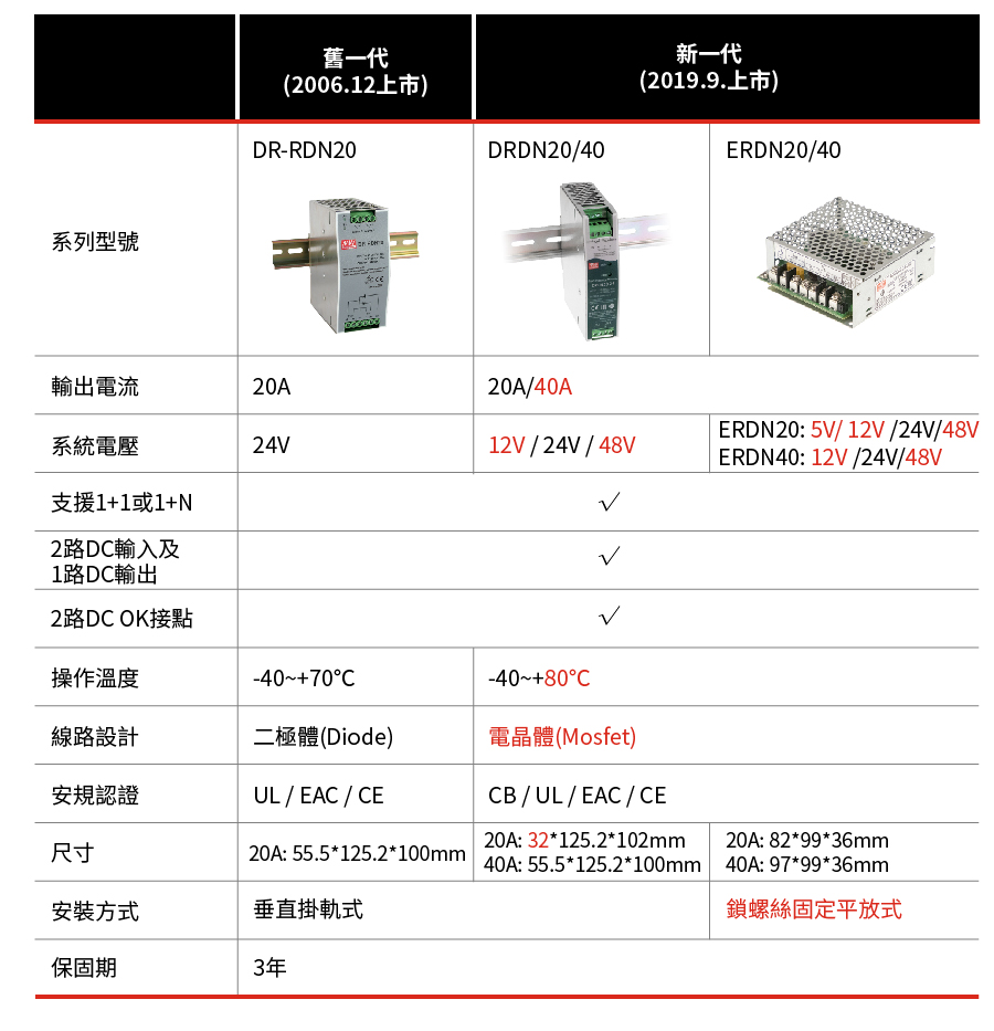 因?yàn)槿哂喈a(chǎn)品需求越來(lái)越多,舊款冗余模塊的體積與效能無(wú)法滿足需求,明緯新開發(fā)了次世代軌道型可快速掛軌的DRDN20/40系列,并同時(shí)規(guī)劃了采鎖螺絲固定的機(jī)殼型ERDN20/40系列,新舊世代詳細(xì)差異如圖三所示。