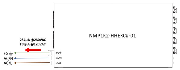據(jù)測試結(jié)果顯示,NMP1K2-HHEKC#-01在230Vac時的漏電流為234μA,遠(yuǎn)低于四臺MSP電源856μA的總漏電流。因此,NMP1K2-HHEKC#-01的漏電流可以滿足消費性電子設(shè)備的500μA~750μA的漏電流要求。