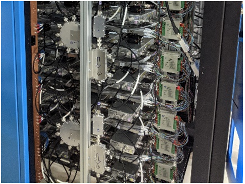 該標(biāo)案規(guī)劃使用多套96kW之高功率電源系統(tǒng)(圖三),使用電源系統(tǒng)輸出的電力驅(qū)動全固態(tài)射頻功率放大器(Radio Frequency Power Amplifier)叢集(圖四)產(chǎn)生高頻能量,匯集高頻能量供應(yīng)電子于趨近光速運(yùn)行所需之能量(圖五),全部電源系統(tǒng)最大輸出直流功率將近800kW !