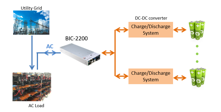 在化成與分容的過程需要持續(xù)對電池芯充放電,龐大的耗電量亦是可觀的生產(chǎn)成本,為節(jié)省生產(chǎn)成本,化成分容柜制造商會如圖二所示設計,經(jīng)由BIC-2200能源回饋式雙向交直流電源供應器與雙向DC/DC轉(zhuǎn)換器,順向工作時,可以對電池進行充電;反向工作時,則對電池放電,并將電能回收電力系統(tǒng),提供給其他AC負載使用,藉以節(jié)省電費成本。