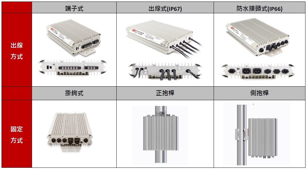 HEP-2300系列包含四種不同輸出電壓55V/115V/230V及380V,適用于高粉塵或室內(nèi)外儀器設(shè)備,輸出電壓可透過三種方式調(diào)整,包含內(nèi)建可變電阻方式、透過可程序化(PV/PC)功能,亦可透過數(shù)字通訊如CANBus/PMBus/MODbus等,對輸出電壓及電流做調(diào)整,方便結(jié)合人機(jī)接口做系統(tǒng)整合與控制使用。HEP-2300系列除提供不同的輸出電壓,亦提供三種接線方式,包含傳統(tǒng)端子式、防水出線式及防水接頭式;同時(shí)也提供不同固定方式如掛鉤式,正抱桿或側(cè)抱桿等方式。